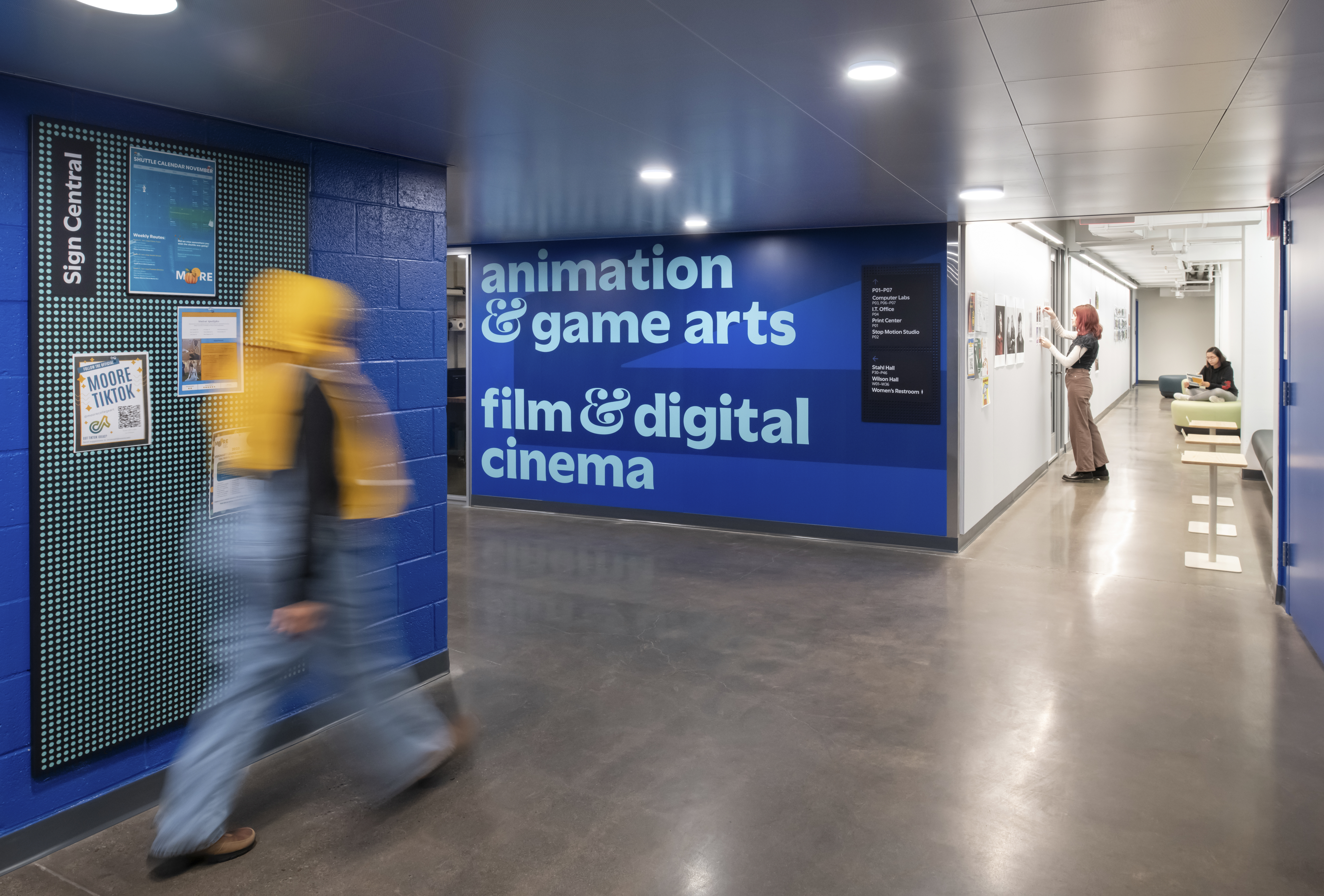 The VAULT is Moore’s lower-level space that connects Wilson Hall and Sarah Peter Hall. It includes the Triangle Lounge, a fun area for hanging out with friends or collaborating on projects, and access to labs like the stop-motion studio and editing bays—ideal for Animation & Game Arts, Film & Digital Cinema and Entertainment Design students bringing their vision to life.
